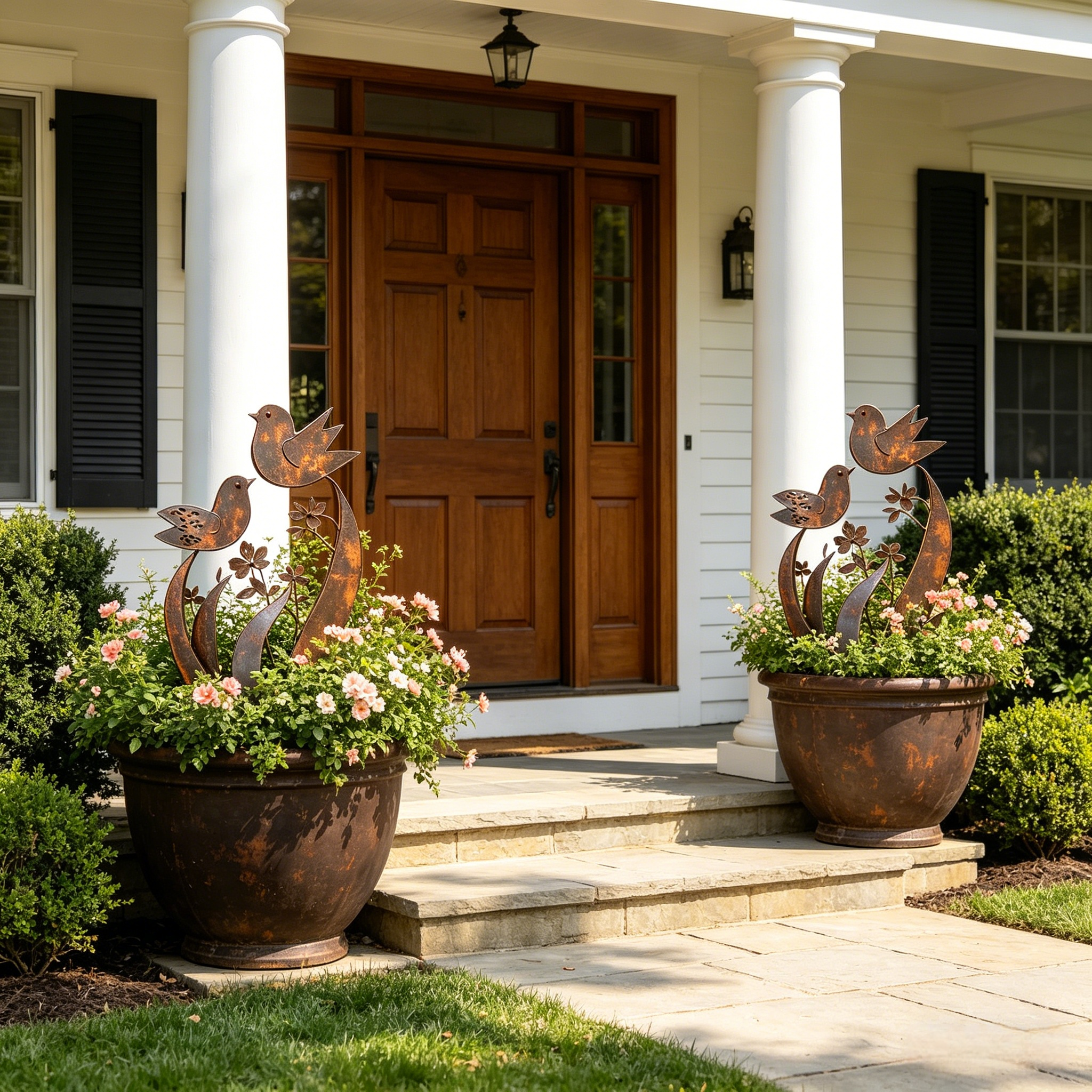 The weathered patina finish gives it a warm rustic look that blends beautifully into flower beds, walkways, patios, and porch planters. Whether placed among blooming flowers or displayed as a standalone accent, it instantly adds depth, character, and a welcoming touch to your outdoor space.