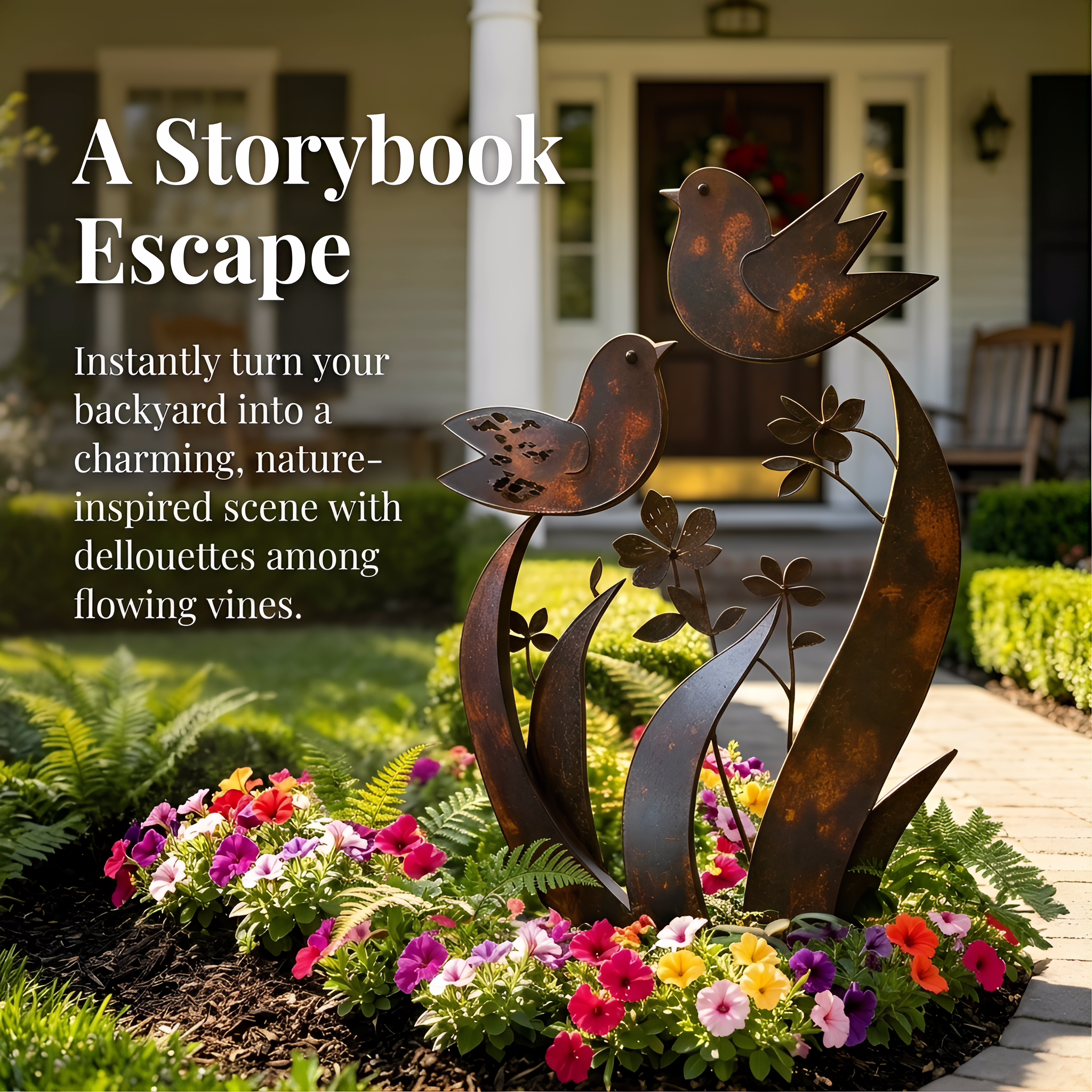 Bring a sense of peace and personality to your garden with this rustic metal bird sculpture. Designed with two charming birds perched among wildflowers and flowing leaves, this decorative piece captures the quiet beauty of nature in an elegant, timeless way.